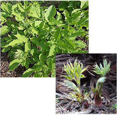 Aralia cordata is an upright herbaceous perennial plant growing up to 2 to 3 metres (6.6 to 9.8 ft) in height, native to Japan, Korea and eastern China. It is known as udo ( 独活) in Japanese, and also as Japanese spikenard or "mountain asparagus". It is commonly found on the slopes of wooded embankments. Aralia cordata is a species of Aralia in the Araliaceae family. Young stems are consumed from the roots and added to soups and salads. It must be properly cooked, as the raw stems are coated in a resin tasting similar to pine. Prior to eating, they should be thinly sliced and boiled in water a few times or placed in chilled water for an hour to eliminate the resin. The stems may be cooked like asparagus. ... from Wikipedia ... |